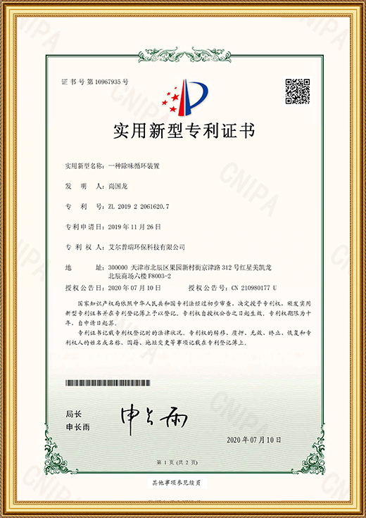 • 實用新型專利證書(一種除味循環(huán)裝置)